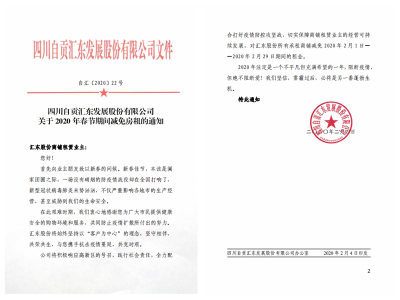 公司将积极响应高新区的号召,践行社会责任,全力配合打好疫情防控攻坚战,切实保障商铺租赁业主的经营可持续发展,对汇东股份所有承租商铺减免2020年2月1日——2020年2月29日期间的租金。