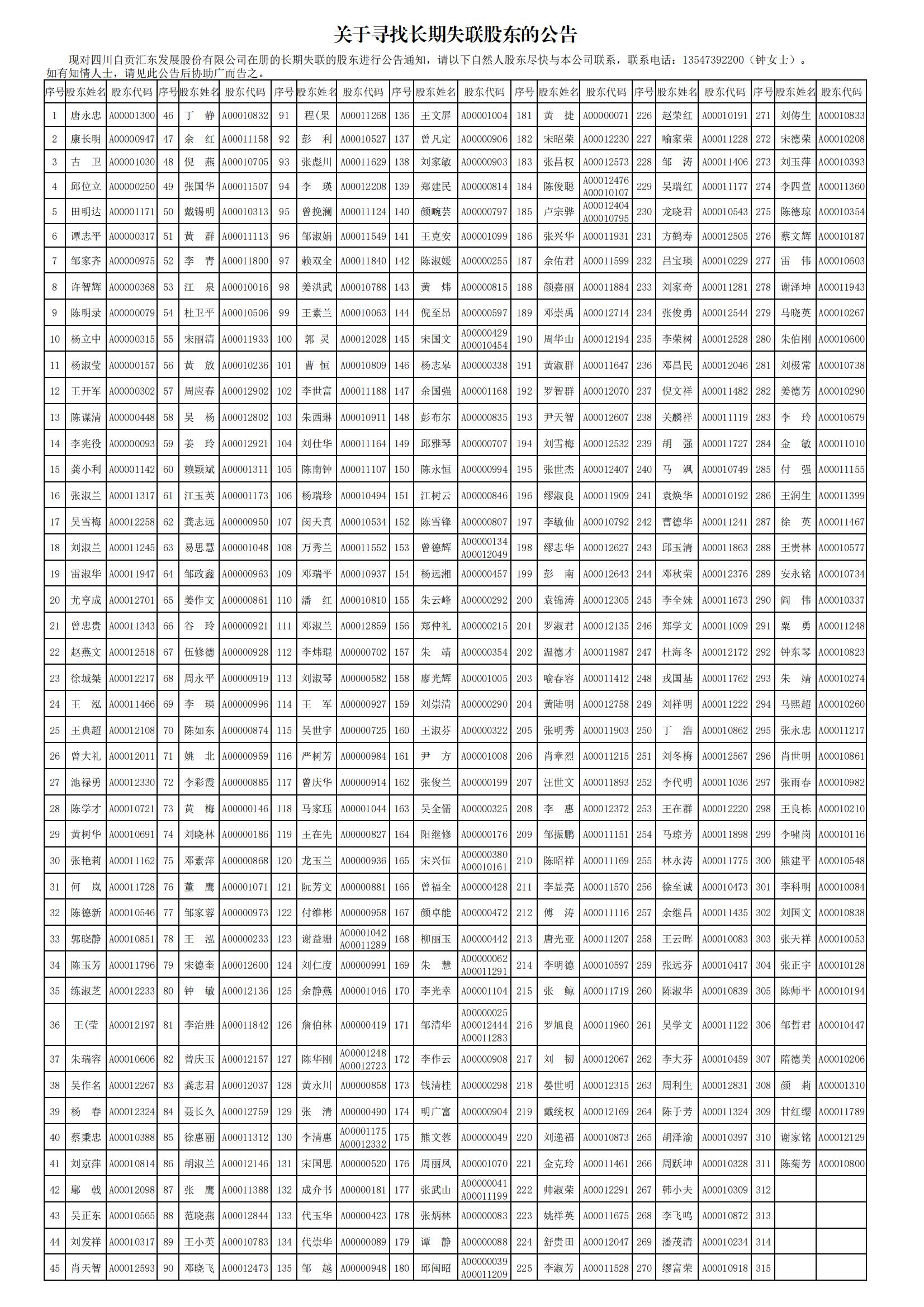 现对四川自贡汇东发展股份有限公司在册的长期失联的股东进行公告通知,请以下自然人股东尽快与本公司联系,联系人:钟女士,联系电话:13547392200。如有知情人士,请见此公告后协助广而告之。