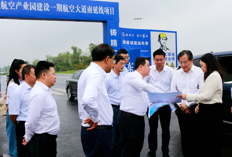 2021年6月9日上午,市委书记范波市长曾洪杨一行,冒雨来到航空产业园建设一期航空大道南延线项目现场调研,希望各级部门及建设单位要抓住机遇,保质量、保进度、保安全的前提下,确保省重点项目如期交付使用。