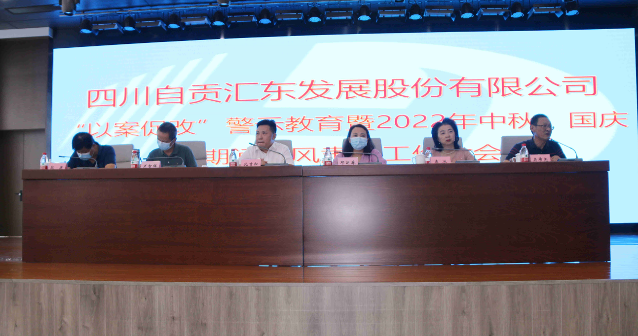 2022年9月8日,汇东股份公司组织召开了“以案促改”警示教育暨2022年中秋、国庆节期间正风肃纪工作大会,公司中层以上人员共计62人参会。会议由汇东股份公司党委书记、董事长沈才松主持,公司党委全体成员列席,市纪委第八室邓运乔组长、国资委纪检组兰智祥副组长莅临指导。