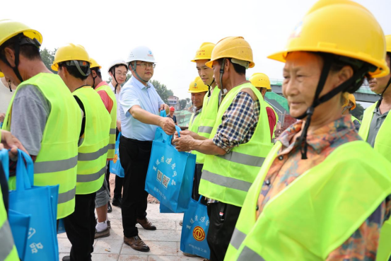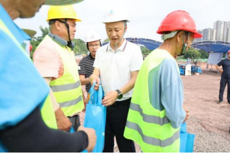 随后,陈鹏一行向现场工友发放了夏季高温清凉“大礼包”。