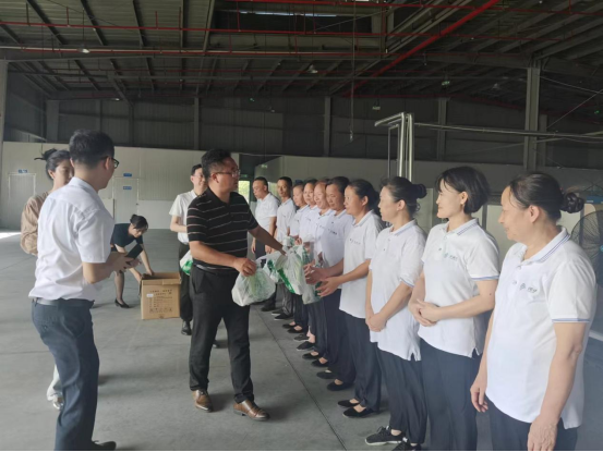 在发放过程中副总经理袁红戟表示一线职工是公司最宝贵的财富,是公司发展的基石,嘱托大家在高温天气下,一定要注意身体,合理安排工作与休息时间,确保安全生产与个人健康两不误。