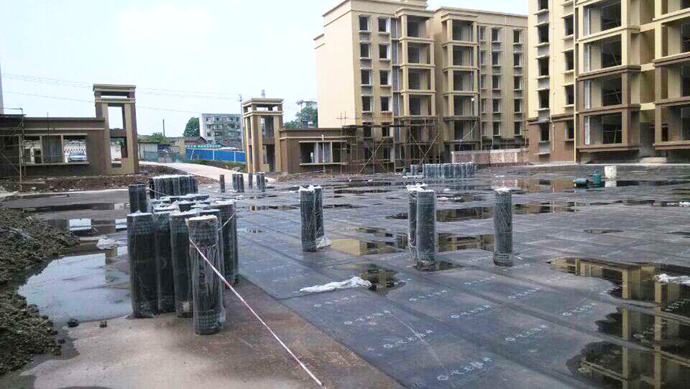 大西洋焊接产业园动迁安置房2#车库顶,防水卷材施工作业进行中。
