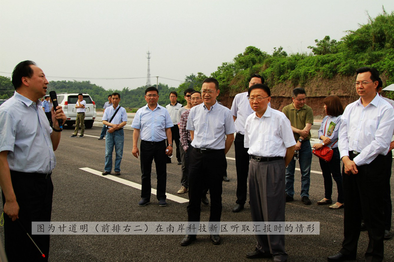 2016年5月18日下午,由省委省政府决策咨询委员会主任甘道明率领的调研组一行莅临高新区,调研南岸科技新区及地下综合管廊规划建设情况。市委书记李刚、副市长唐杰、副市长张邦举、高新区党工委副书记叶茂恒、高新区管委会副主任杨敬华等陪同调研。调研中,甘道明一行听取了叶茂恒副书记关于南岸科技新区总体规划、功能分区及基础实施项目建设的情况汇报。甘道明指出,高新区还要继续深化规划,用国际化视野、高标准来规划建设南岸科技新区,要继续完善新区基础设施投资保障机制,通过多元化融资渠道破解资金难题,优化政府服务,为企业在新区投资建设营造最佳投资环境。甘道明希望,高新区继续加大重大项目招商引资力度,加快在建项目建设进度,着力培育壮大新兴产业,加快提升改造传统产业,推动高新区经济持续健康发展。
