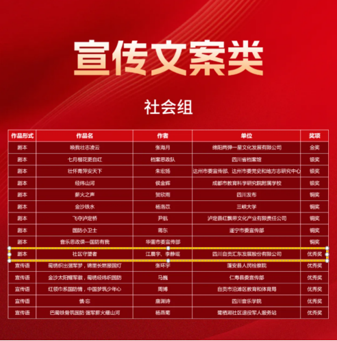 ? ?今年3月,省委宣传部、教育厅、退役军人事务厅、省国资委、省国动办、省军区政治工作局联合举办四川省首届“爱我国防”文化创意大赛。大赛受到社会各界广泛关注,共计征集作品18379件。经多轮评选,汇东股份公司报送的剧本《社区守望者》在众多作品中脱颖而出,荣获宣传文案类社会组优秀奖。