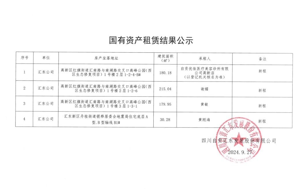 1 | 汇东公司 | 高新区红旗街道汇南路与南湖路交叉口高峰公园(西区生态修复项目)1号楼2层1-2-4-B# | 180.18 | 自贡优佳医疗美容诊所有限公司高新店 (以登记机关核名为准) |