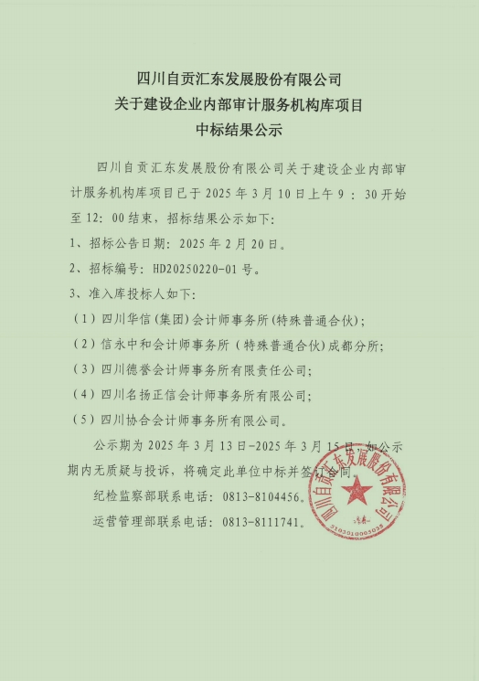 四川自贡汇东发展股份有限公司关于建设企业内部审计服务机构库项目已于2025年3月10日上午9 :30开始至12:00结束,招标结果公示如下: