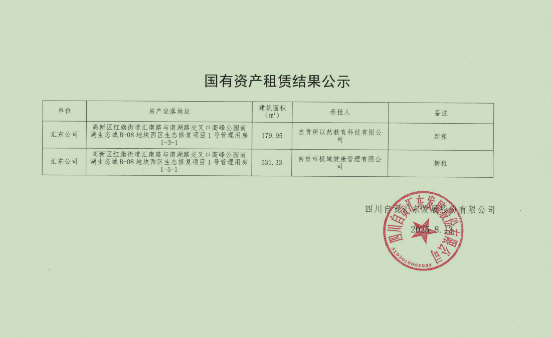 汇东公司 | 高新区红旗街道汇南路与南湖路交叉口高峰公园南湖生态城B-08地块西区生态修复项目1号管理用房1-5-1 | 531.33 | 自贡市极域健康管理有限公司 | 新租 |