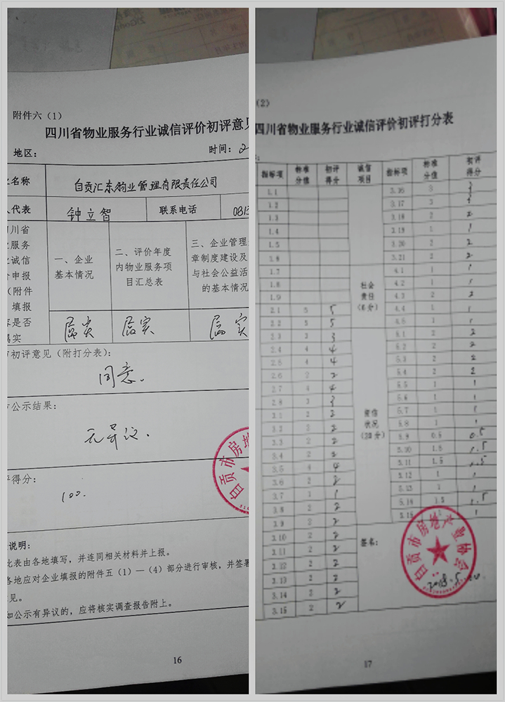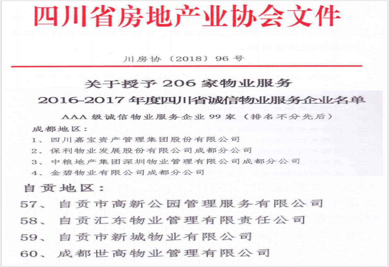 8月20日,经四川省房地产业协会、物业服务行业诚信评价工作领导小组审定,自贡汇东物业管理有限责任公司荣获“2016—2017年度四川省AAA级诚信物业服务企业”荣誉称号,此次评选全省共评选出99家AAA级企业,而我市仅9家企业获此殊荣,汇东物业以内容详实、丰富、客观、完整的资料和取得的工作实效,受到了省、市评选工作考核小组的充分肯定和好评,该荣誉的获得标志着汇东物业在企业信用建设及社会信用评级方面取得了可喜成绩,必将进一步增强公司的品牌价值和市场竞争力。