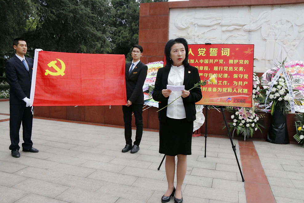 在党委副书记李冰的主持领誓下,全体人员面对鲜红的党旗,在高耸的烈士纪念碑前,重温了入党誓词,用铿锵的誓言将忠诚信念铭刻在心。
