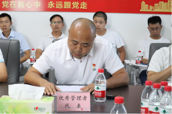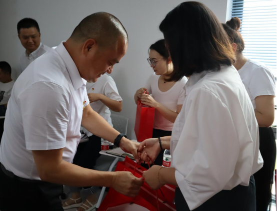会上,支部副书记、副总经理肖利带领领导班子向全体同事发放周年庆纪念品。