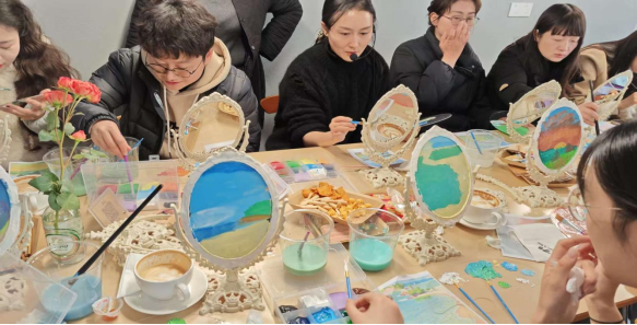 ? ? 活动当天,请到了专业的油画老师为大家从油画的起源讲起,带大家回溯到文艺复兴时期,领略油画诞生之初的魅力。老师还分享了不同风格的油画特点,从基础的构图,到色彩的冷暖对比,再到不同笔触营造的质感,让大家对油画创作有了初步认识。在整个讲解过程中大家认真聆听,不时提问,学习氛围浓厚。课后,经过数小时的创作,大胆构思、细心调色、精心绘制出了自己喜欢的油画成果,或色彩明艳,或笔触细腻。女职工们相互欣赏,分享创作心得,现场欢声笑语。