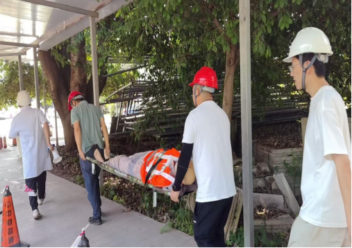 ? ? 针对夏季户外作业特点,模拟G348道路养护人员中暑场景,现场人员迅速将患者转移至阴凉处,通过解开束缚、湿毛巾物理降温、喂服藿香正气水等规范操作实施初步救援,随后及时送医,强化了高温作业安全防护意识。此环节落实了国家对高温作业劳动保护政策,提升了作业人员自我保护与应急救援能力。